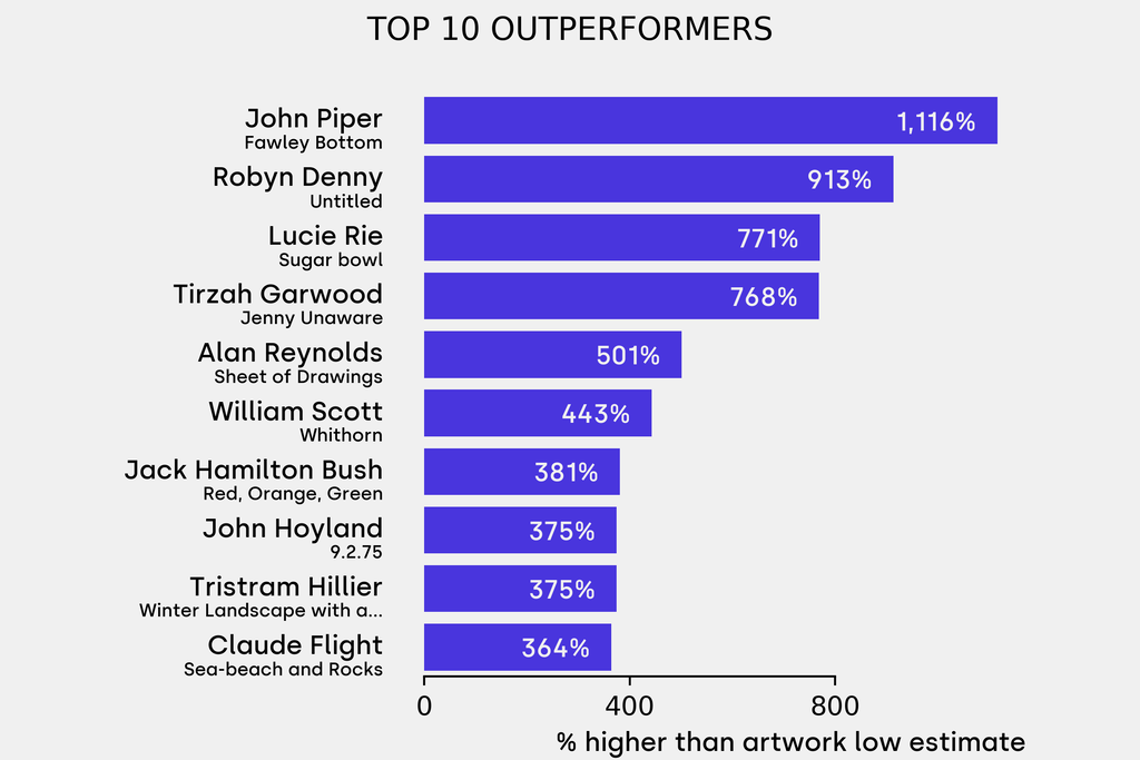 The outperformer sold for 1115% above its low estimate. John Piper, Fawley Bottom (1981), sold for $81,500 ($6,705 low estimate). It has not been traded before.