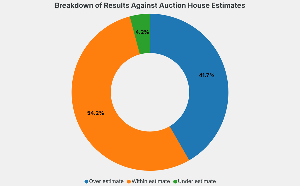 All results include the fees and premiums added to the price of a work of art when the auctioneer's hammer falls. Estimates, sale prices and totals are converted into US dollars. Sale prices are compared to the auction house’s low estimate, which do not include premiums.