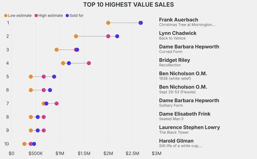 The star lot was: Frank Auerbach, Christmas Tree at Mornington Crescent (2004), which sold for $2.67m, 33% above its $2m low estimate. It has been traded 3 times in the past.