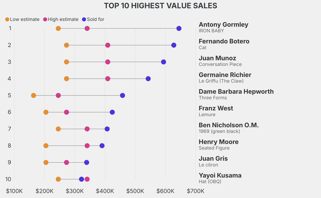 The star lot was: Antony Gormley, IRON BABY (1999), which sold for $644,800, 162% above its $245,500 low estimate. It has been traded 3 times in the past.