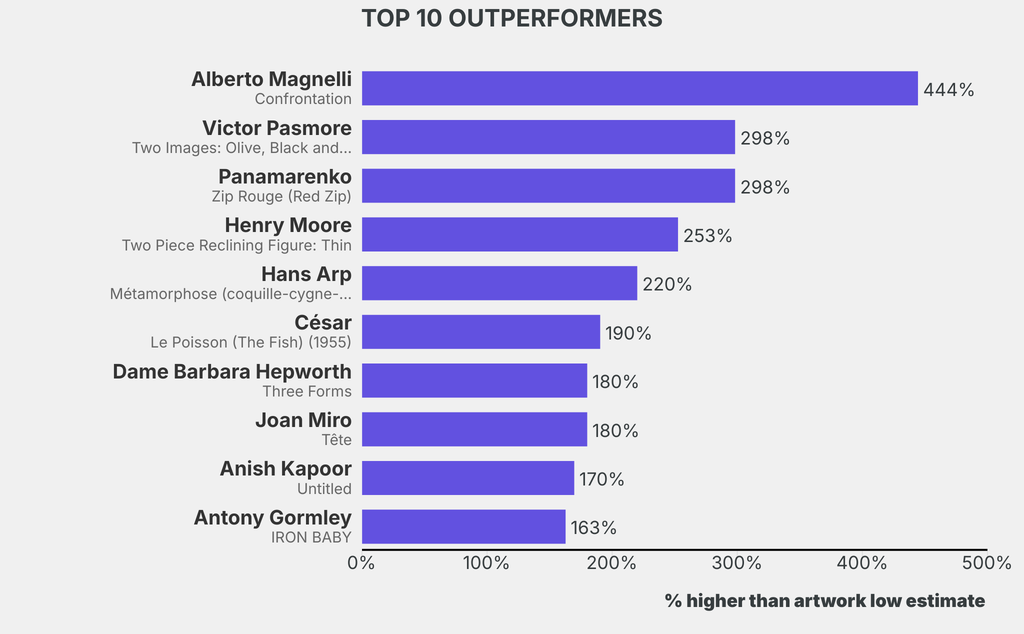 The outperformer sold for 444% above its low estimate. Alberto Magnelli, Confrontation (1952), sold for $296,900 ($54,500 low estimate). It has been traded once in the past.