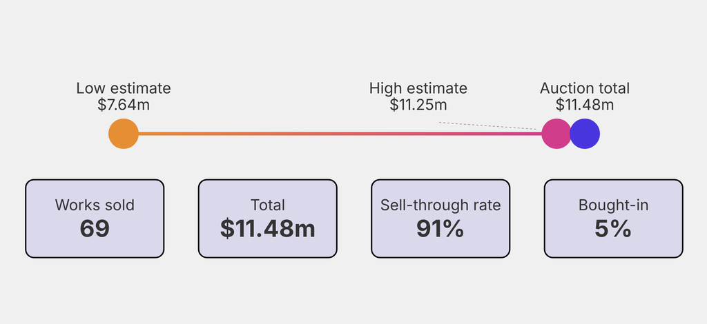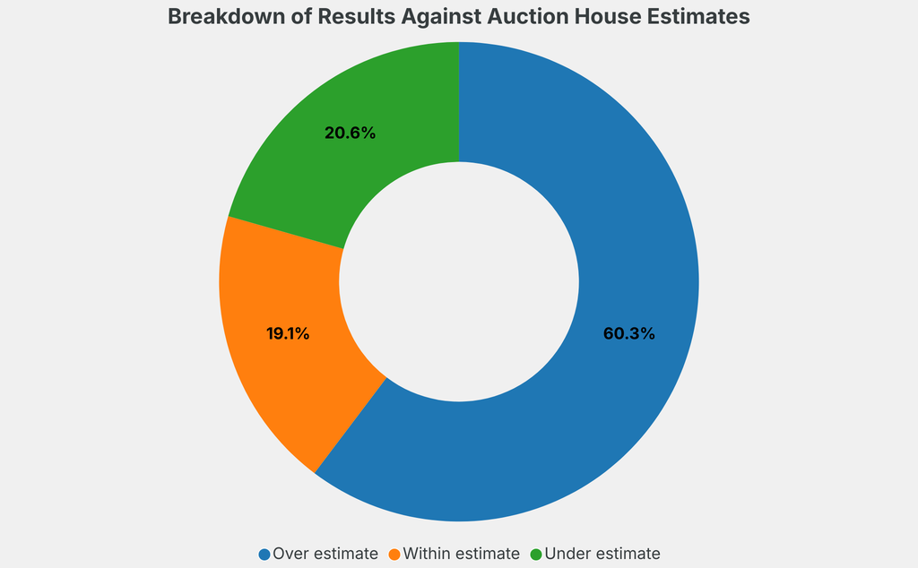 All results include the fees and premiums added to the price of a work of art when the auctioneer's hammer falls. Estimates, sale prices and totals are converted into US dollars. Sale prices are compared to the auction house’s low estimate, which do not include premiums.