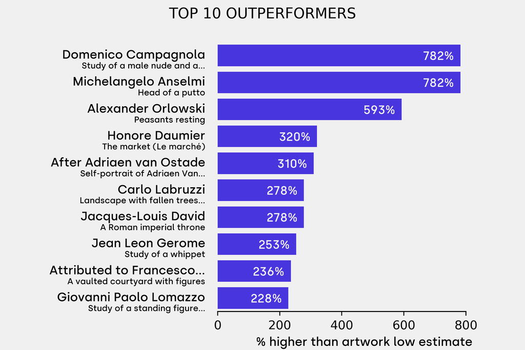 The outperformer sold for 782% above its low estimate. Domenico Campagnola, Study of a male nude and a tree (recto); Studies of two figures fighting (verso) (Undated), sold for $17,600 ($2,000 low estimate). It has been traded once in the past.