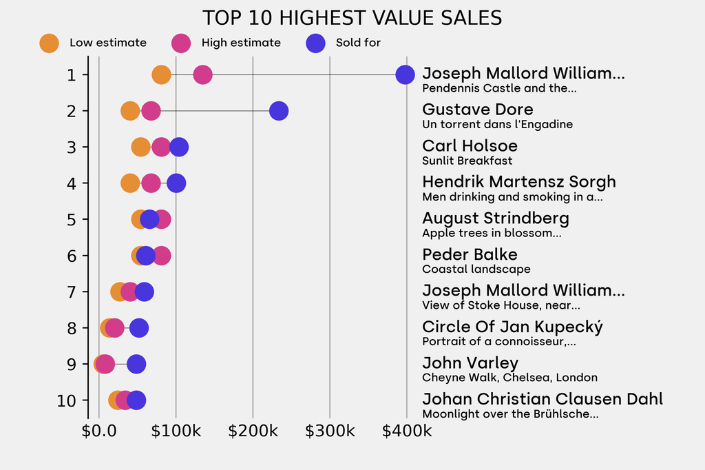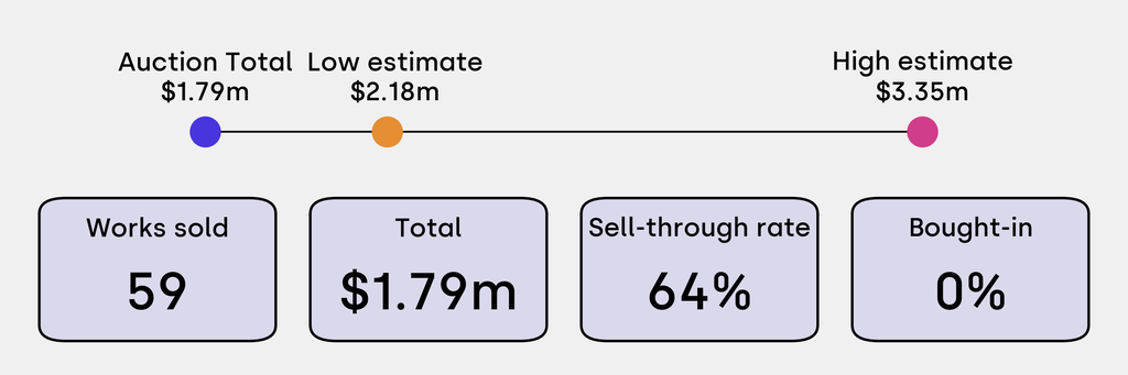 All results include the fees and premiums added to the price of a work of art when the auctioneer's hammer falls. Estimates, sale prices and totals are converted into US dollars. Sale prices are compared to the auction house’s low estimate, which do not include premiums.