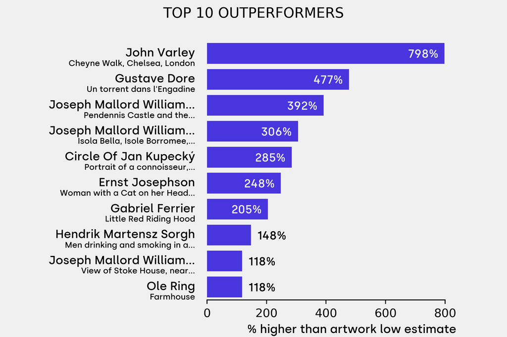 The outperformer sold for 797% above its low estimate. John Varley, Cheyne Walk, Chelsea, London (1816), sold for $48,400 ($5,394 low estimate). It has been traded once in the past.
