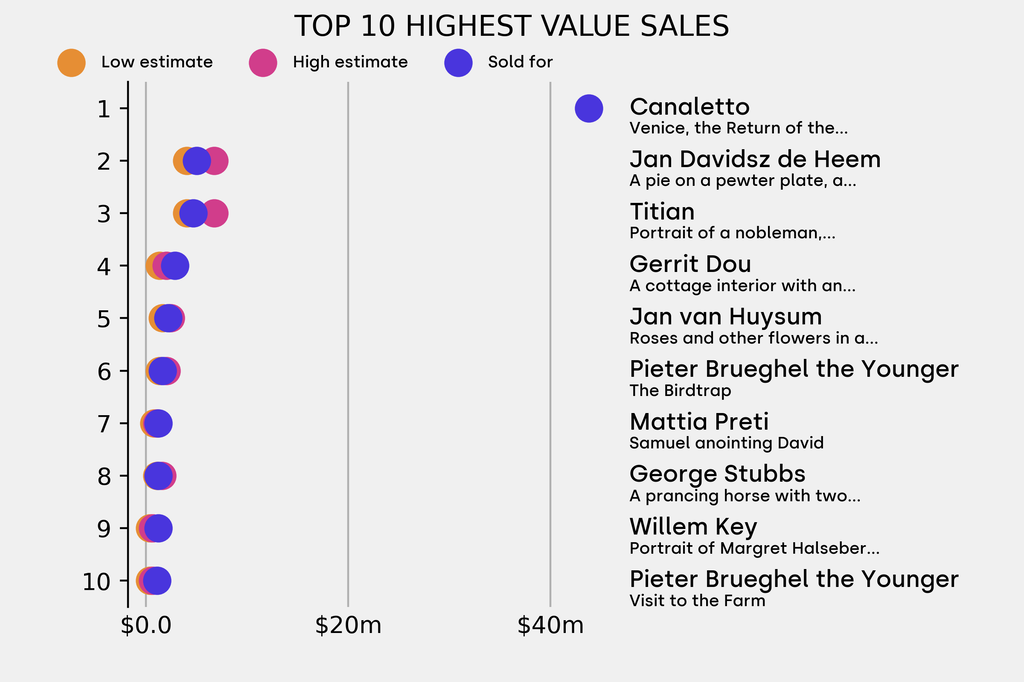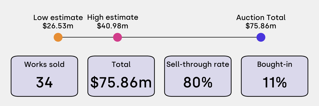 All results include the fees and premiums added to the price of a work of art when the auctioneer's hammer falls. Estimates, sale prices and totals are converted into US dollars. Sale prices are compared to the auction house’s low estimate, which do not include premiums.