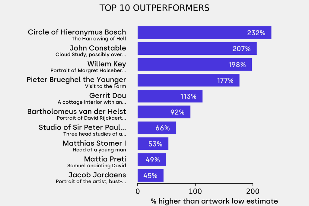 The outperformer sold for 232% above its low estimate. Circle of Hieronymus Bosch, The Harrowing of Hell (Undated), sold for $225,100 ($67,800 low estimate). It has been traded 4 times in the past.