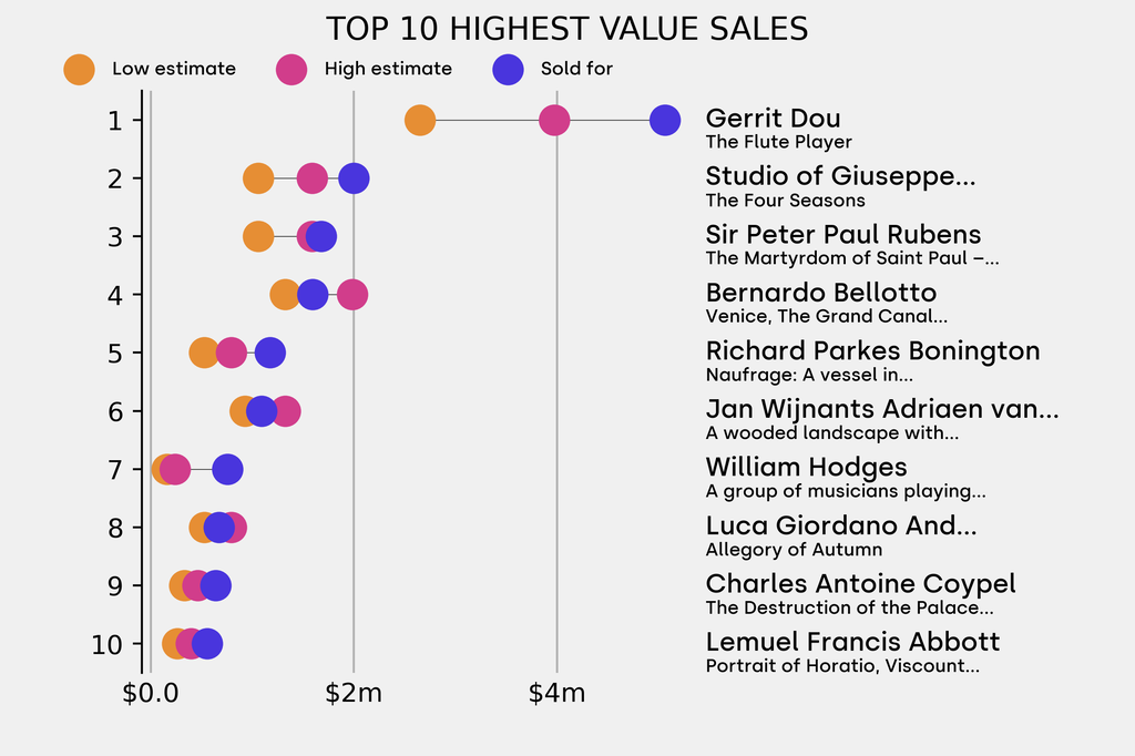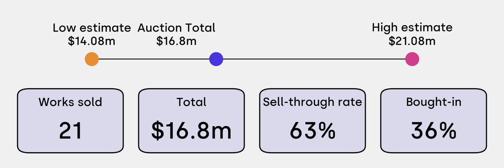 All results include the fees and premiums added to the price of a work of art when the auctioneer's hammer falls. Estimates, sale prices and totals are converted into US dollars. Sale prices are compared to the auction house’s low estimate, which do not include premiums.