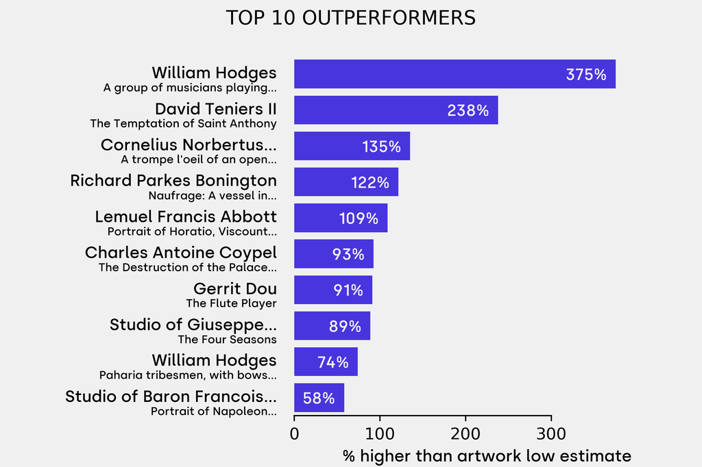 The outperformer sold for 375% above its low estimate. William Hodges, A group of musicians playing Sarangi, a Tambura and Tablas (Undated), sold for $755,100 ($158,900 low estimate). It has been traded once in the past.