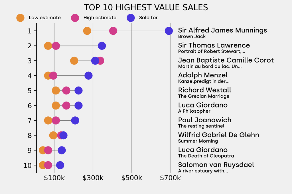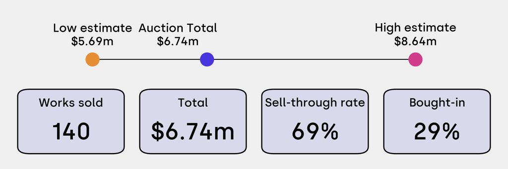 All results include the fees and premiums added to the price of a work of art when the auctioneer's hammer falls. Estimates, sale prices and totals are converted into US dollars. Sale prices are compared to the auction house’s low estimate, which do not include premiums.