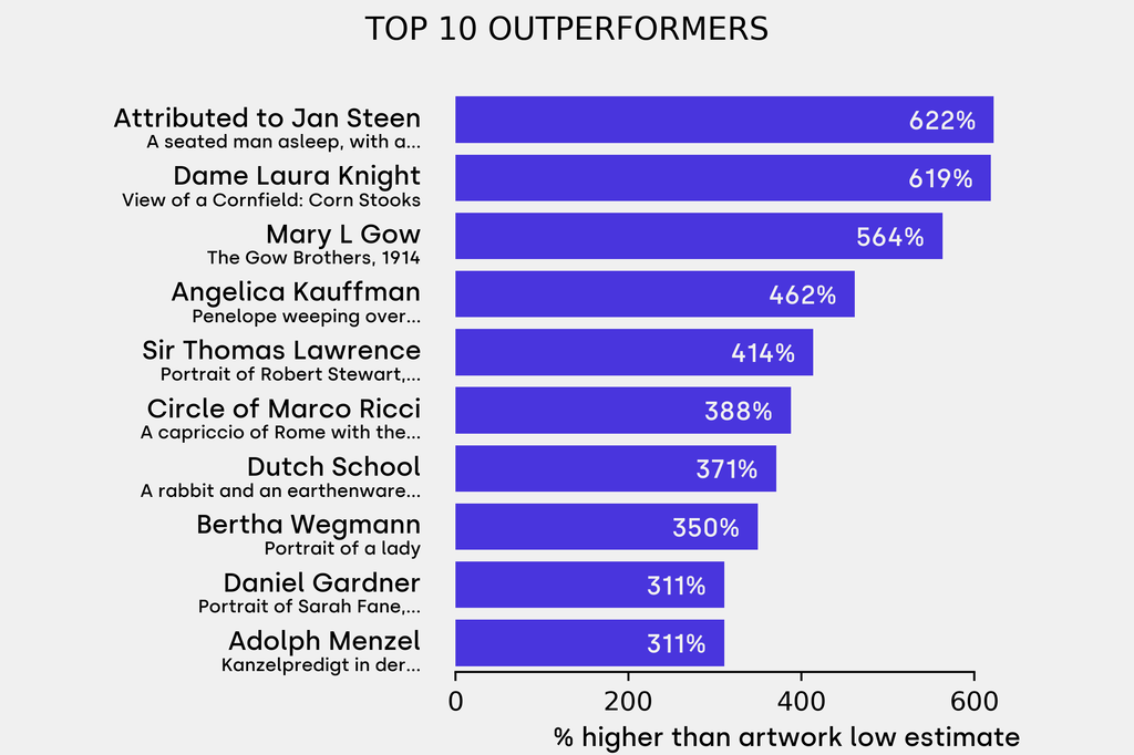 The outperformer sold for 622% above its low estimate. Attributed to Jan Steen, A seated man asleep, with a bottle in his lap (Undated), sold for $77,800 ($10,800 low estimate). It has been traded twice in the past.