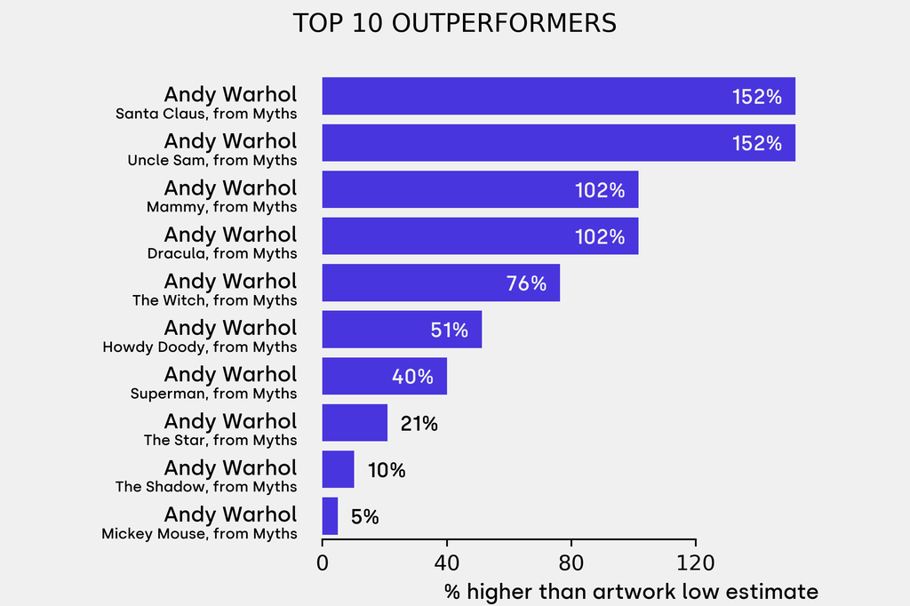 The outperformer sold for 152% above its low estimate. Andy Warhol, Santa Claus, from Myths (1981), sold for $50,400 ($20,000 low estimate).