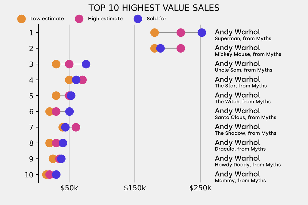 The star lot was: Andy Warhol, Superman, from Myths (1981), which sold for $252,000, 39% above its $180,000 low estimate.