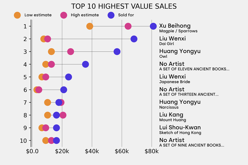 The star lot was: Xu Beihong, Magpie / Sparrows (1945), which sold for $81,100, 110% above its $38,500 low estimate. It has been traded once in the past.