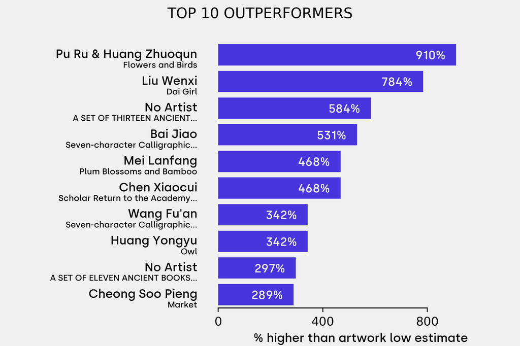 The outperformer sold for 910% above its low estimate. Pu Ru & Huang Zhuoqun, Flowers and Birds (1950), sold for $13,000 ($1,284 low estimate).