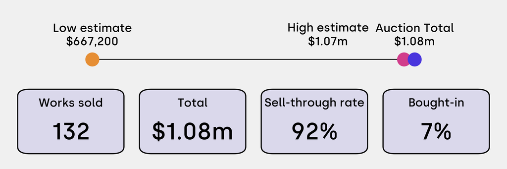 All results include the fees and premiums added to the price of a work of art when the auctioneer's hammer falls. Estimates, sale prices and totals are converted into US dollars. Sale prices are compared to the auction house’s low estimate, which do not include premiums.