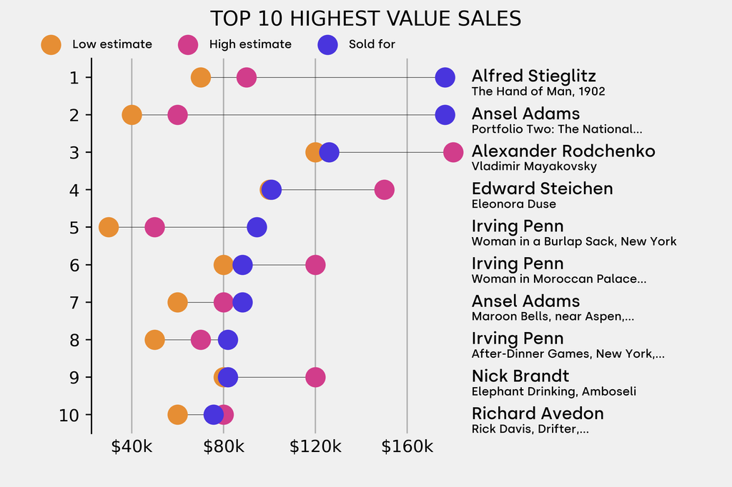 The star lot was: Alfred Stieglitz, The Hand of Man, 1902 (1910), which sold for $176,400, 152% above its $70,000 low estimate. It has been traded 3 times in the past.