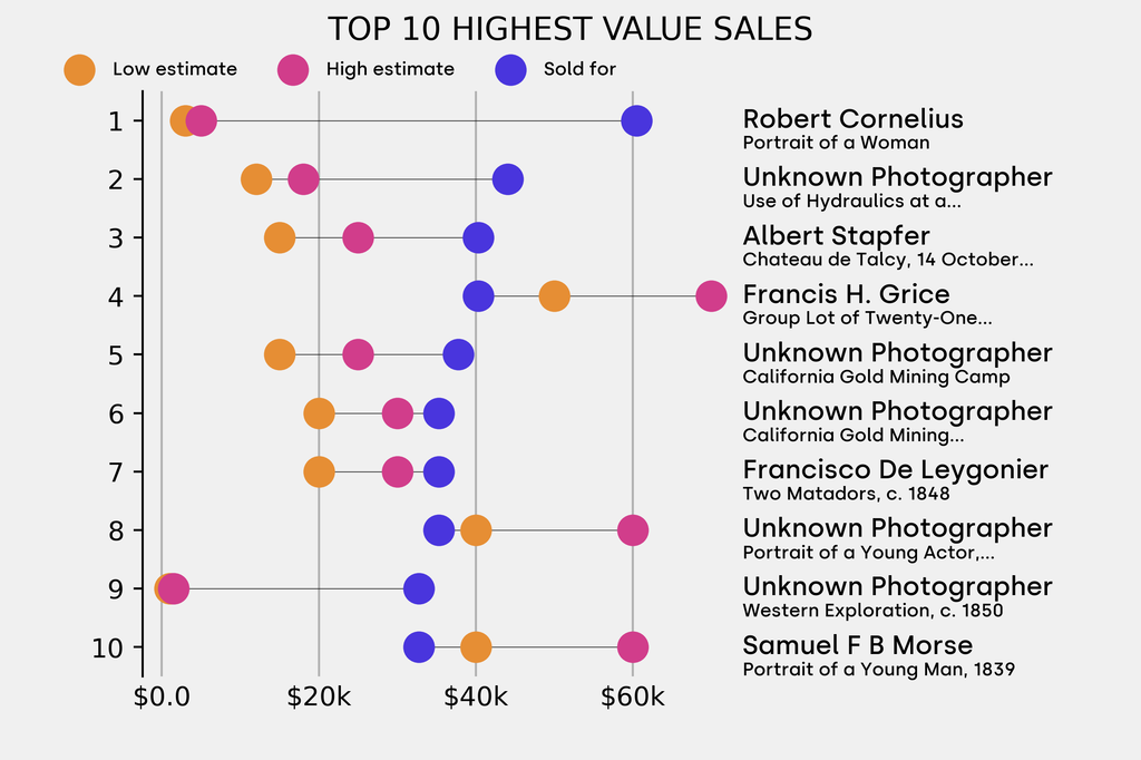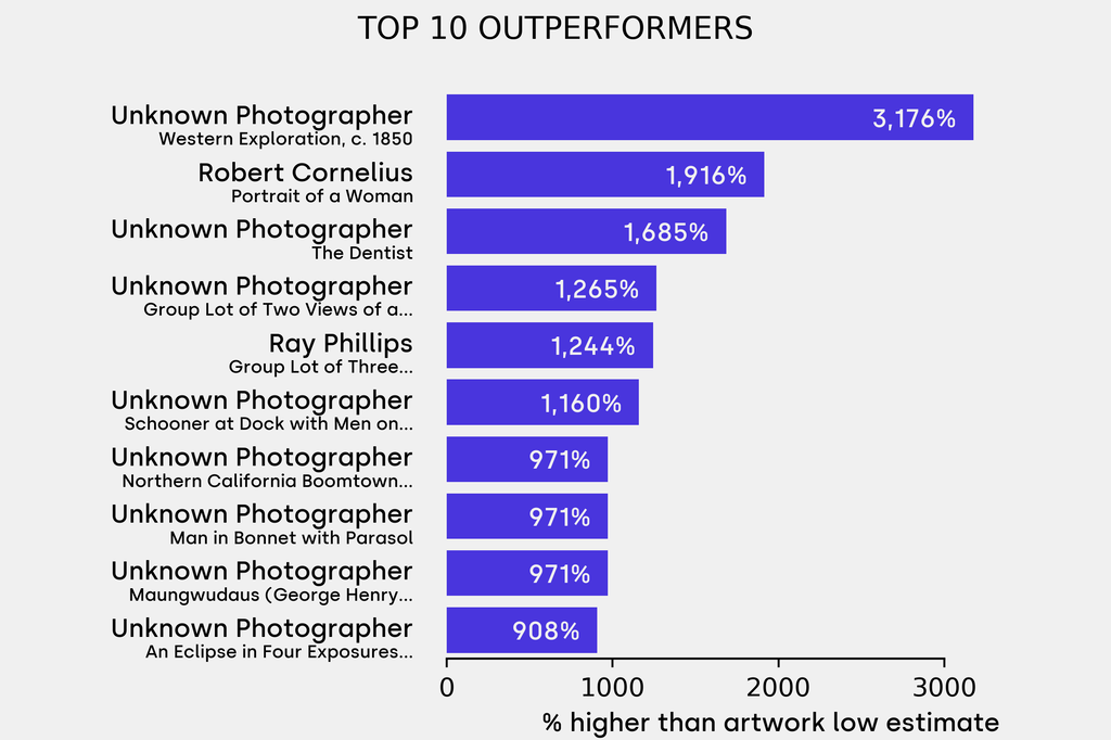 The outperformer sold for 3176% above its low estimate. Unknown photographer, Western Exploration, c. 1850 (1850), sold for $32,800 ($1,000 low estimate). It has been traded once in the past.