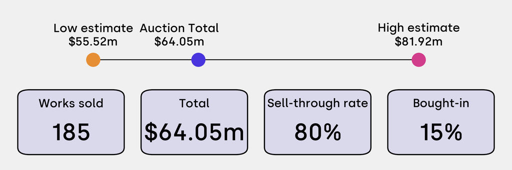 All results include the fees and premiums added to the price of a work of art when the auctioneer's hammer falls. Sale prices are compared to the auction house’s low estimate, which do not include premiums.