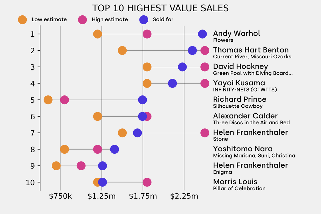10 works were withdrawn before the sale, including: Adolph Gottlieb, Excalibur #2 (1963) estimated at $800,000 (low) to $1.2m (high).