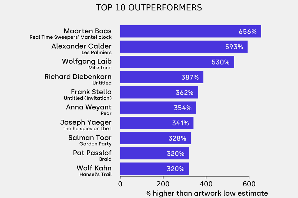 The outperformer sold for 656% above its low estimate. Maarten Baas, Real Time Sweepers' Mantel clock (2019), sold for $151,200 ($20,000 low estimate). It has not been traded before.