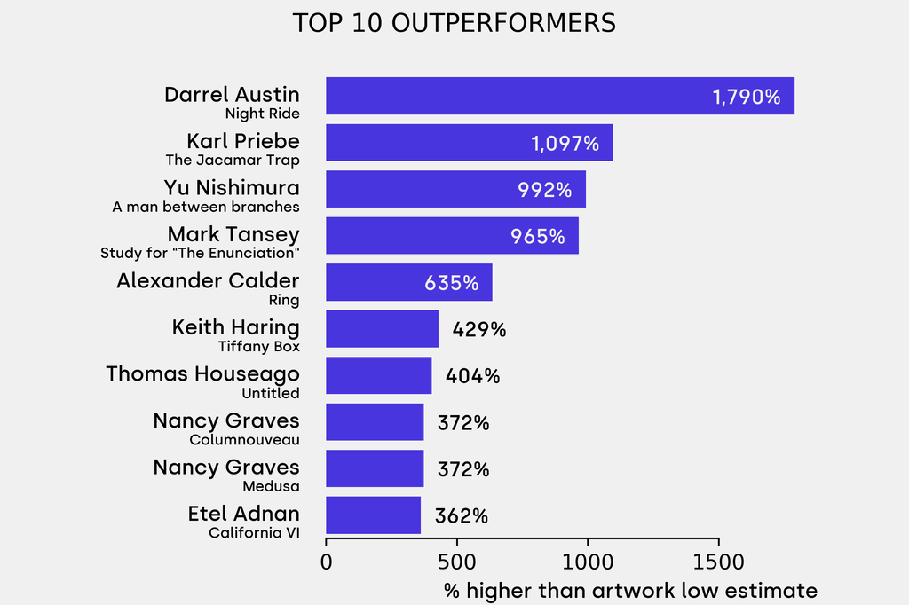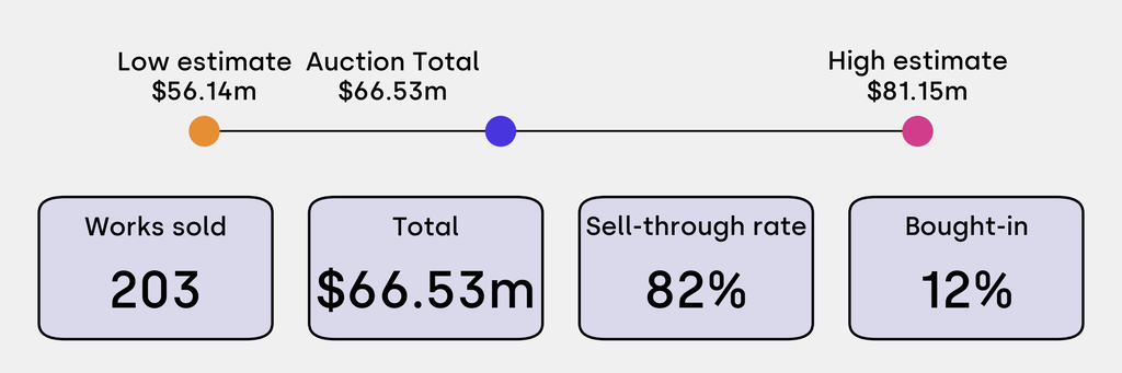 All results include the fees and premiums added to the price of a work of art when the auctioneer's hammer falls. Sale prices are compared to the auction house’s low estimate, which do not include premiums.