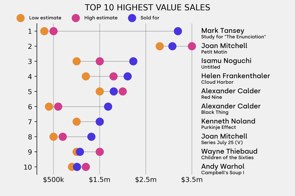 50 works were backed by guarantees, including: Joan Mitchell, Petit Matin (1982). It sold for $3.08m, 9% above its $2.8m low estimate.. It has not been traded before.