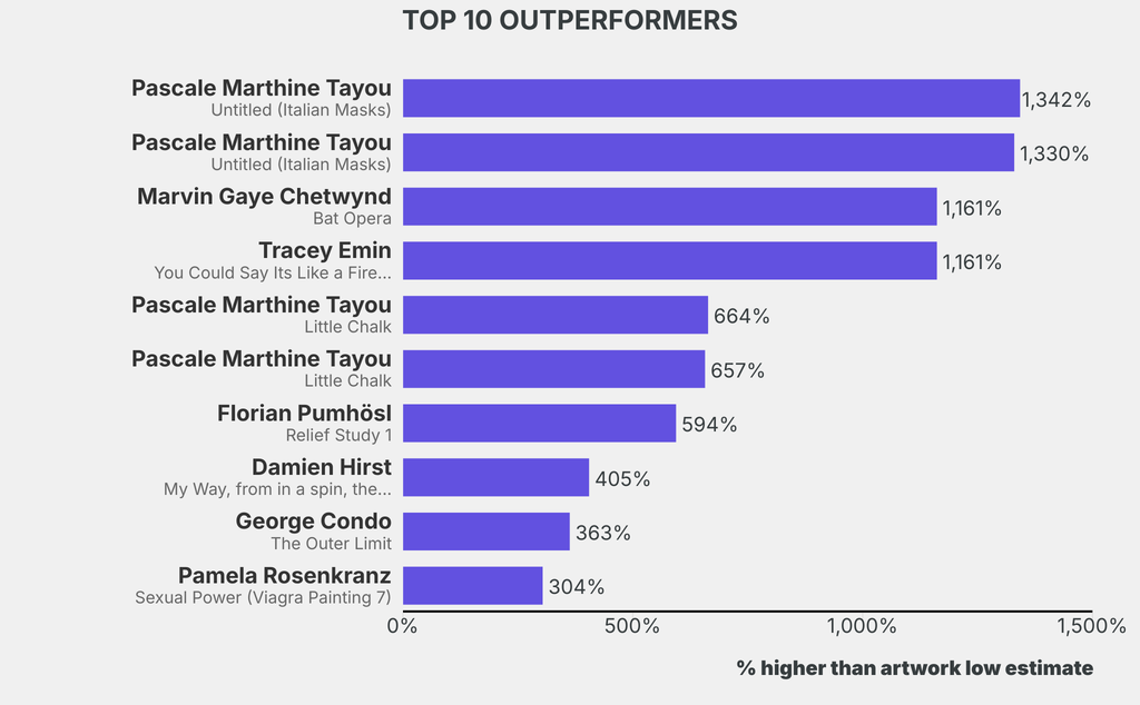 The outperformer sold for 1342% above its low estimate. Pascale Marthine Tayou, Untitled (Italian Masks) (2010), sold for $29,000 ($2,011 low estimate). It has been traded once in the past.