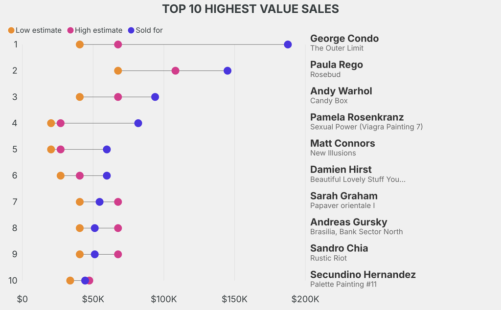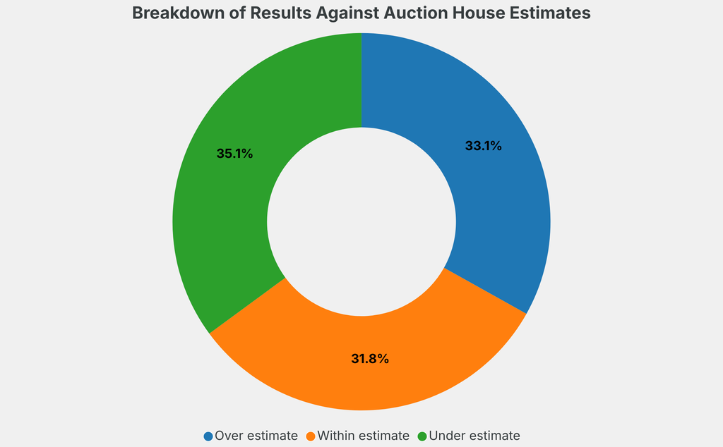 All results include the fees and premiums added to the price of a work of art when the auctioneer's hammer falls. Estimates, sale prices and totals are converted into US dollars. Sale prices are compared to the auction house’s low estimate, which do not include premiums.