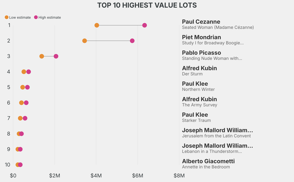 The highest-value lot announced is: Paul Cezanne, Seated Woman (Madame Cézanne) (1902), which is estimated to sell for between $4.03m and $6.33m. The work is backed by a guarantee. It has been traded 5 times in the past.