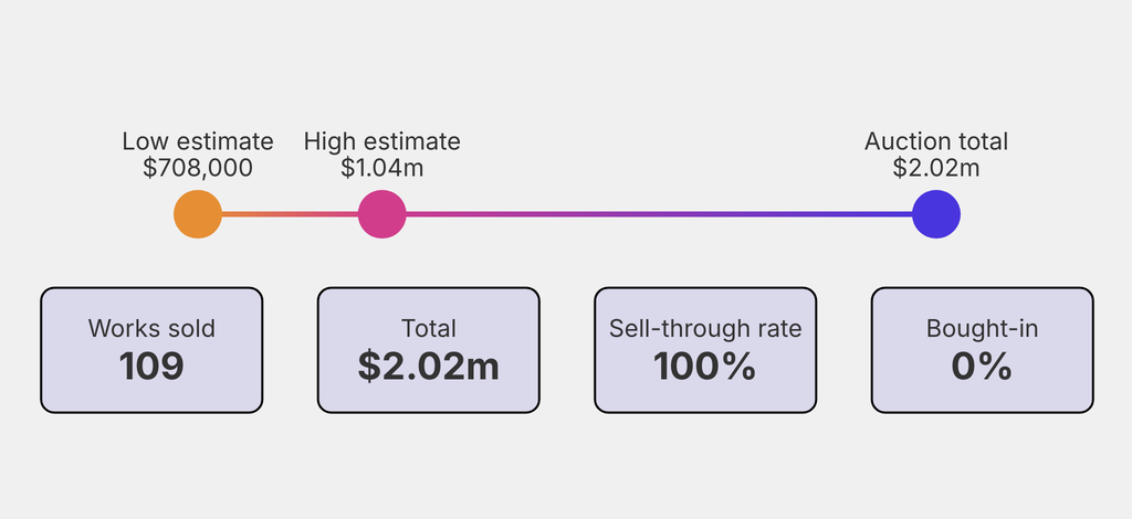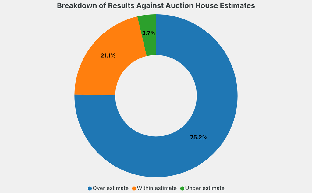 All results include the fees and premiums added to the price of a work of art when the auctioneer's hammer falls. Sale prices are compared to the auction house’s low estimate, which do not include premiums.