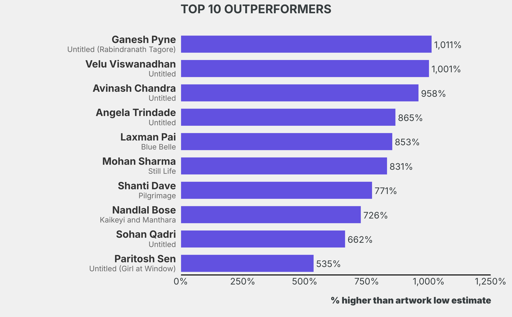 The outperformer sold for 1011% above its low estimate. Ganesh Pyne, Untitled (Rabindranath Tagore) (1980), sold for $44,500 ($4,000 low estimate). It has been traded once in the past.