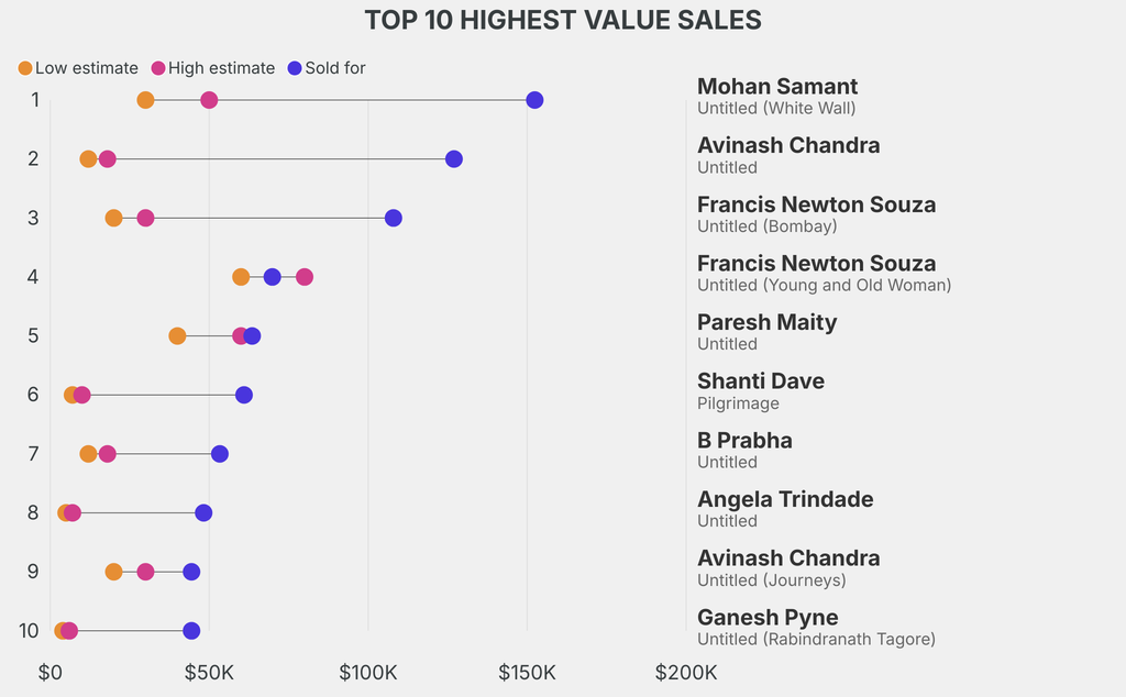 The star lot was: Mohan Samant, Untitled (White Wall) (1960), which sold for $152,400, 408% above its $30,000 low estimate. It has been traded once in the past.