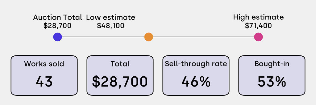 All results include the fees and premiums added to the price of a work of art when the auctioneer's hammer falls. Estimates, sale prices and totals are converted into US dollars. Sale prices are compared to the auction house’s low estimate, which do not include premiums.