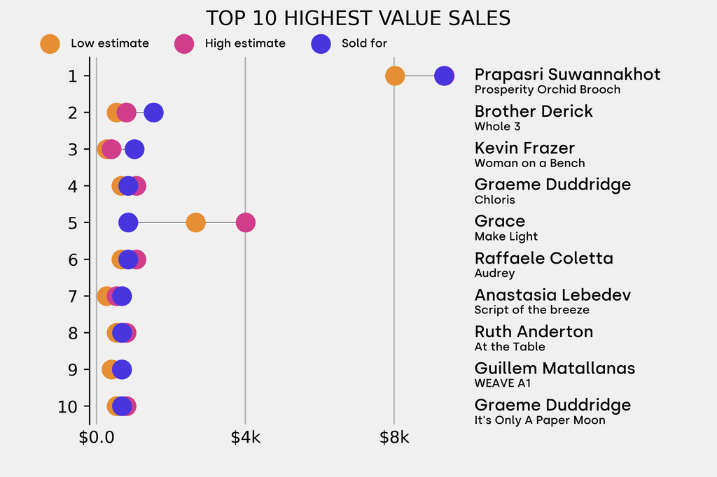 The star lot was: Prapasri Suwannakhot, Prosperity Orchid Brooch (2023), which sold for $9,336, 16% above its $8,019 low estimate.