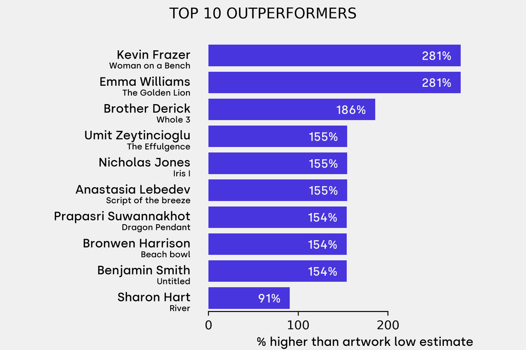 The outperformer sold for 281% above its low estimate. Kevin Frazer, Woman on a Bench (2018), sold for $1,019 ($267 low estimate).