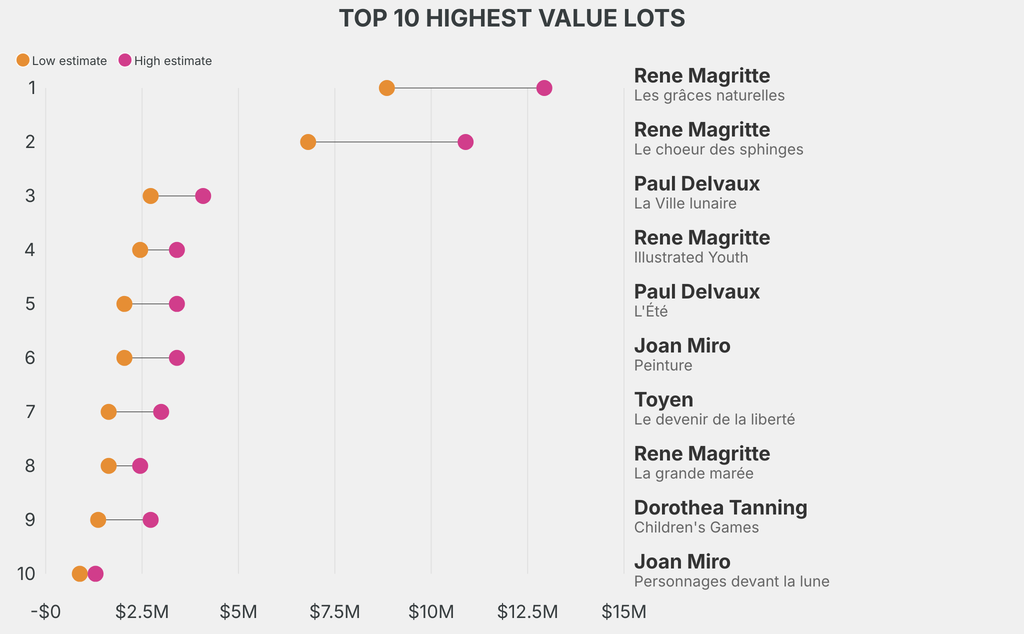 The highest-value lot announced is: Rene Magritte, Les grâces naturelles (1961), which is estimated to sell for between $8.85m and $12.93m. It has been traded 3 times in the past.