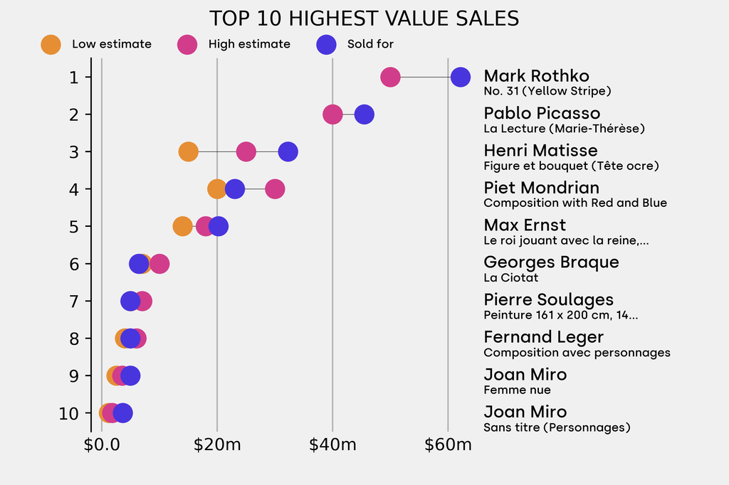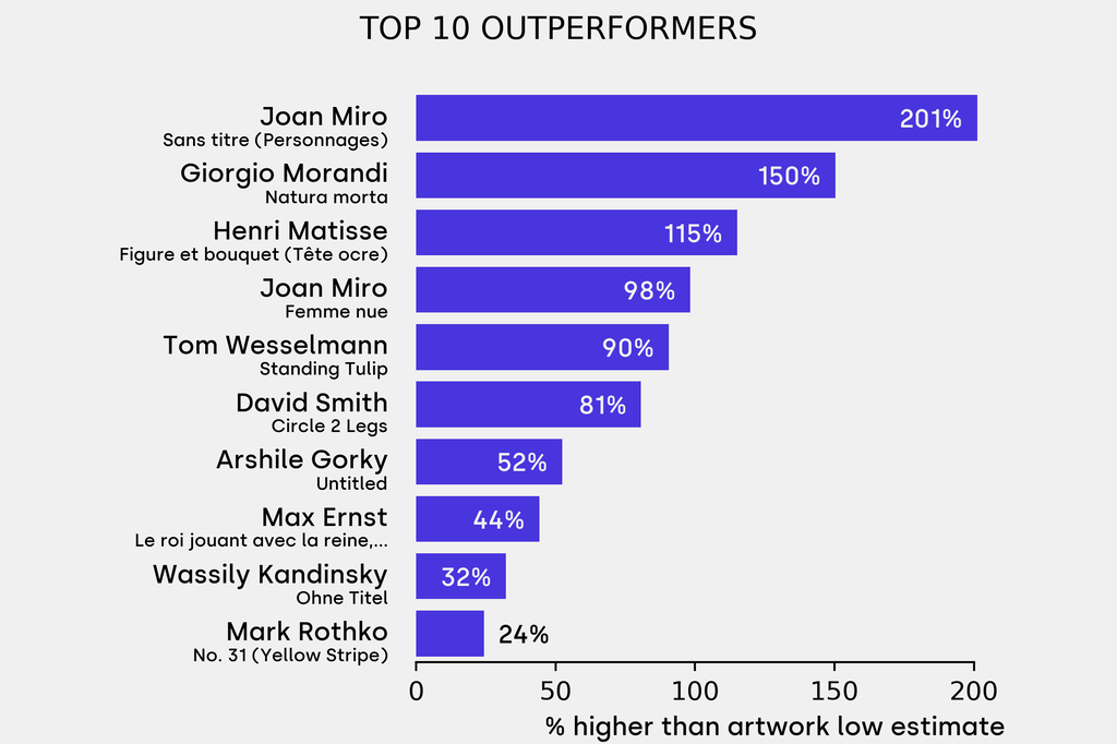 All results include the fees and premiums added to the price of a work of art when the auctioneer's hammer falls. Sale prices are compared to the auction house’s low estimate, which do not include premiums.