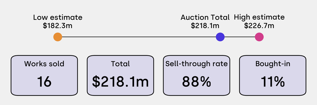 2 works were bought-in, including: Franz Kline, Placidia (1961), estimated at $10m (low) to $15m (high). It has been traded 3 times in the past.