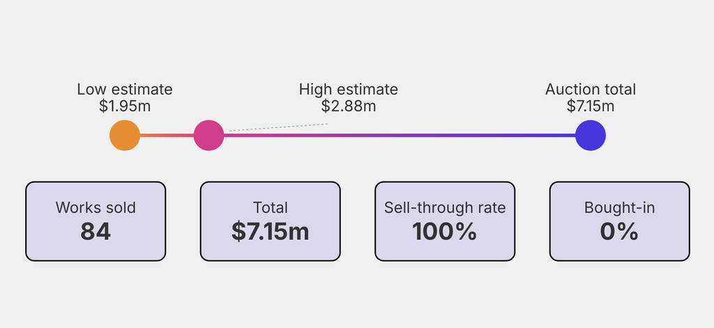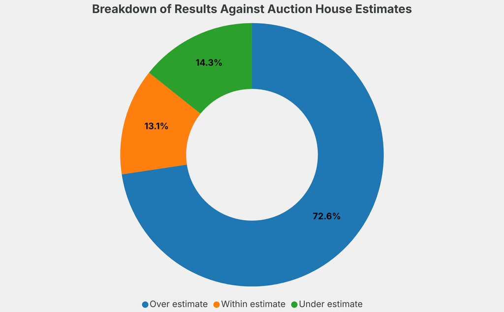 All results include the fees and premiums added to the price of a work of art when the auctioneer's hammer falls. Estimates, sale prices and totals are converted into US dollars. Sale prices are compared to the auction house’s low estimate, which do not include premiums.