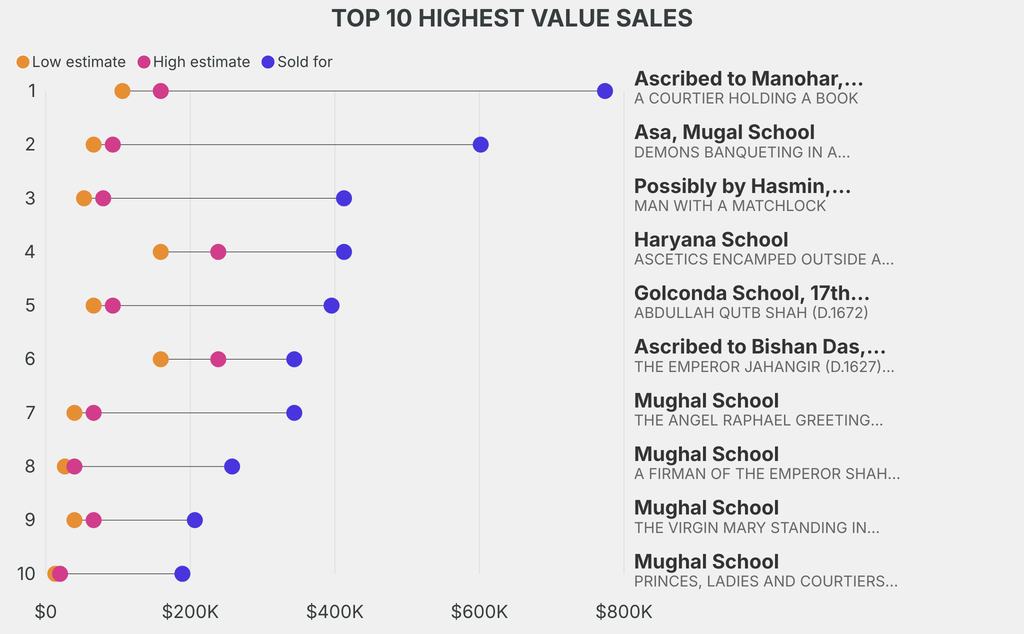 The star lot was: Ascribed to Manohar, Mughal India, A COURTIER HOLDING A BOOK (1608), which sold for $773,800, 629% above its $106,100 low estimate. It has been traded 4 times in the past.