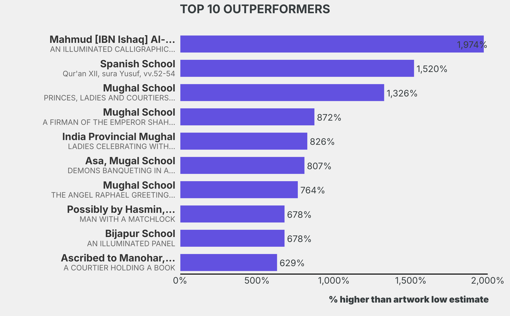 The outperformer sold for 1974% above its low estimate. Mahmud [IBN Ishaq] Al-Shahabi, AN ILLUMINATED CALLIGRAPHIC PANEL (Undated), sold for $41,300 ($1,990 low estimate). It has not been traded before.