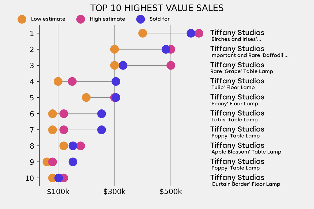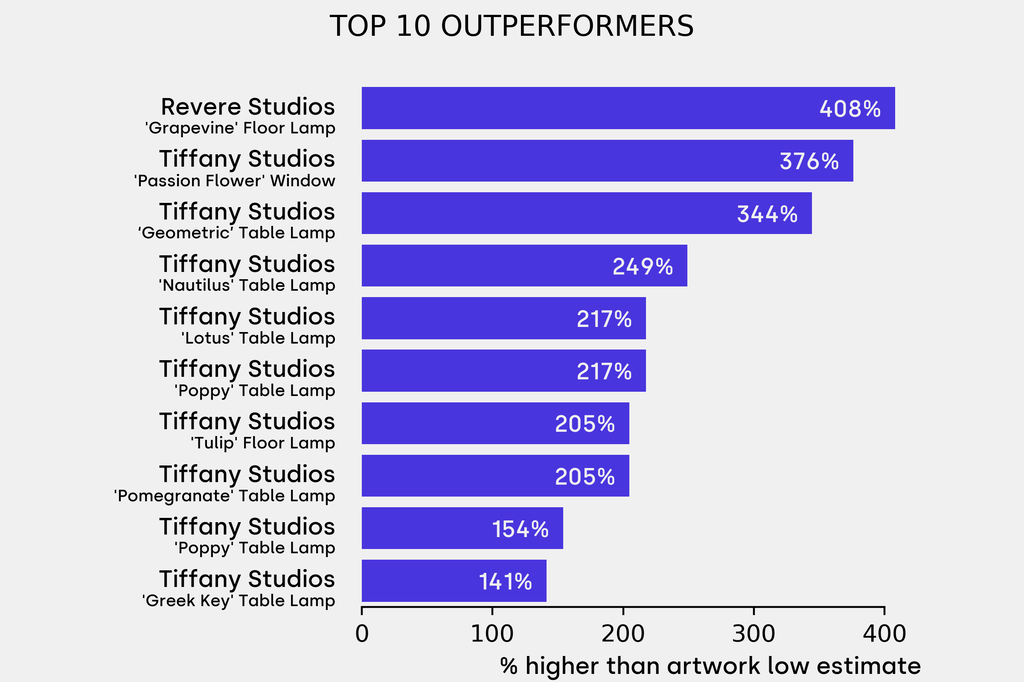 The outperformer sold for 408% above its low estimate. Revere Studios, 'Grapevine' Floor Lamp (1910), sold for $25,400 ($5,000 low estimate).