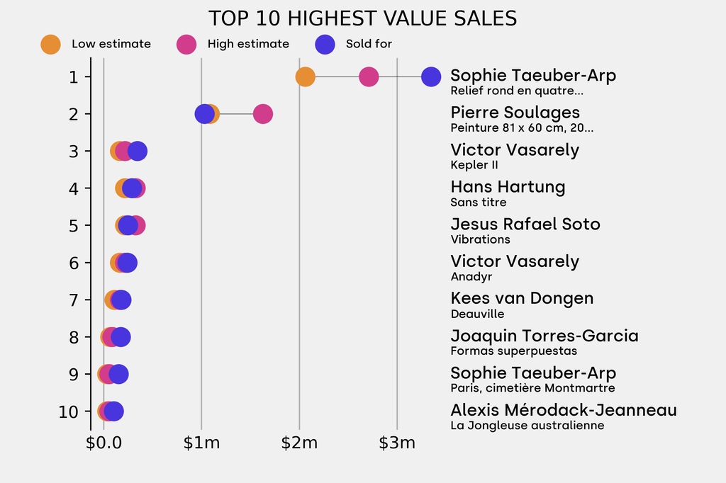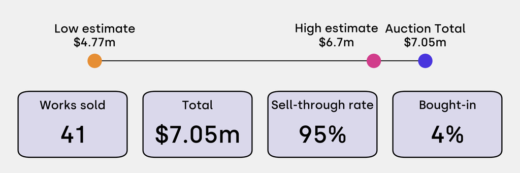 All results include the fees and premiums added to the price of a work of art when the auctioneer's hammer falls. Estimates, sale prices and totals are converted into US dollars. Sale prices are compared to the auction house’s low estimate, which do not include premiums.