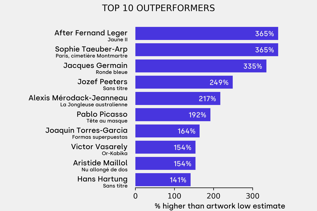 The outperformer sold for 365% above its low estimate. After Fernand Leger, Jaune II (Undated), sold for $15,100 ($3,251 low estimate).
