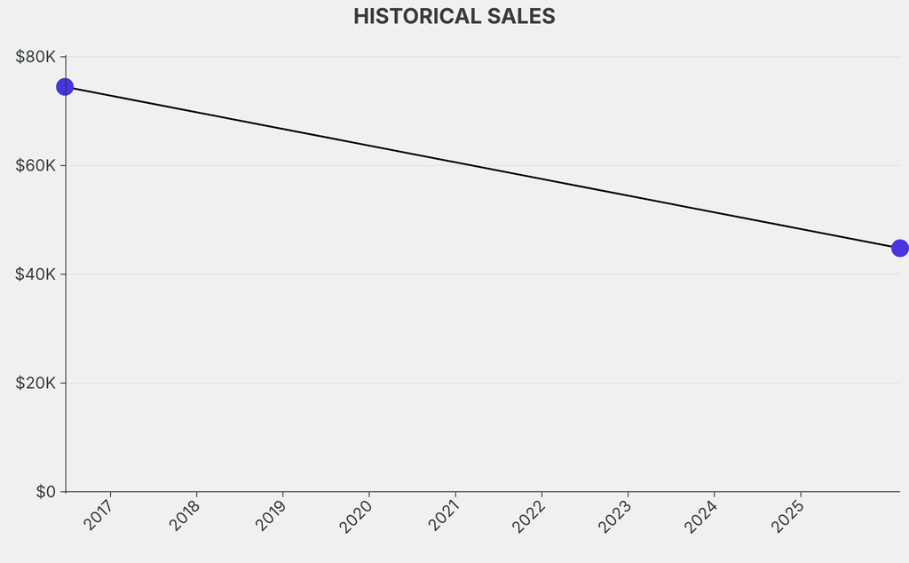 The sale was below the previous auction result by $29,700, realizing a 39% negative return. It last sold at auction in 2016 for $74,500 at Bonhams.