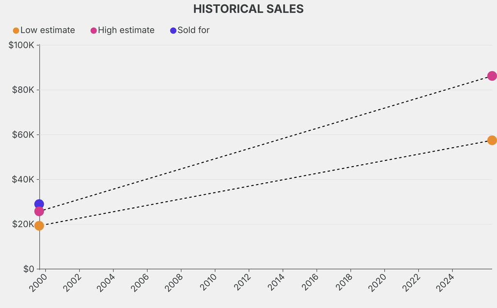 It last sold at auction in 1999 for $29,000 at Christie's. The current low estimate is 197% higher than its previous low estimate of $19,300.
