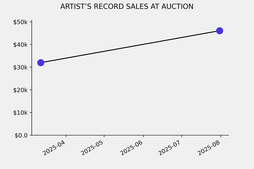 The sale beat the artist’s previous auction record by $14,100, a 43% rise. His previous record was set by Andy Warhol (Marilyn, Green), 2020 (2020), which sold for $32,000 at Bonhams on March 12, 2025. The work had not been traded before.