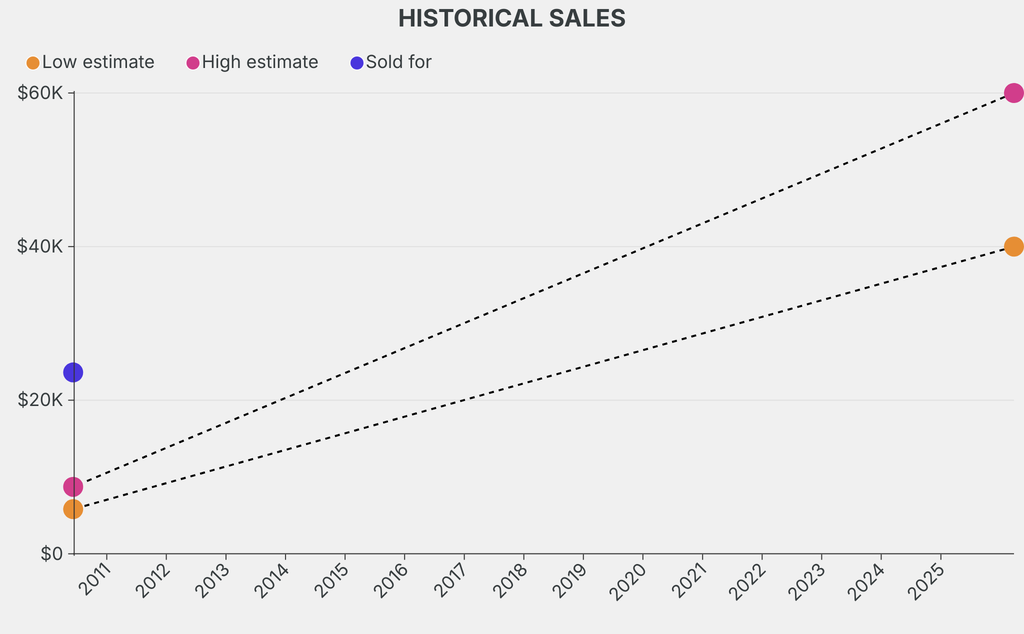 It last sold at auction in 2010 for $23,600 at Christie's. The current low estimate is 588% higher than its previous low estimate of $5,813.