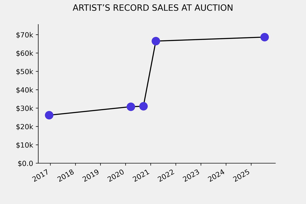 The sale beat the artist’s previous auction record by $2,176, a 3% rise. His previous record was set by Say A Prayer For Me (2020), which sold for $66,500 at Sotheby's, Online on March 16, 2021. The work had not been traded before.